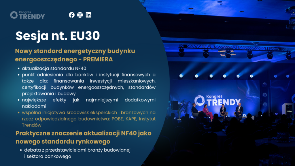 Podczas wydarzenia przedstawiona zostanie propozycja nowego standardu dla budynków jednorodzinnych – EU30, opracowana we współpracy POBE, KAPE oraz Instytutu Trendów. To inicjatywa, która może stać się kluczowym krokiem w kierunku bardziej zrównoważonego i efektywnego energetycznie budownictwa w Polsce.