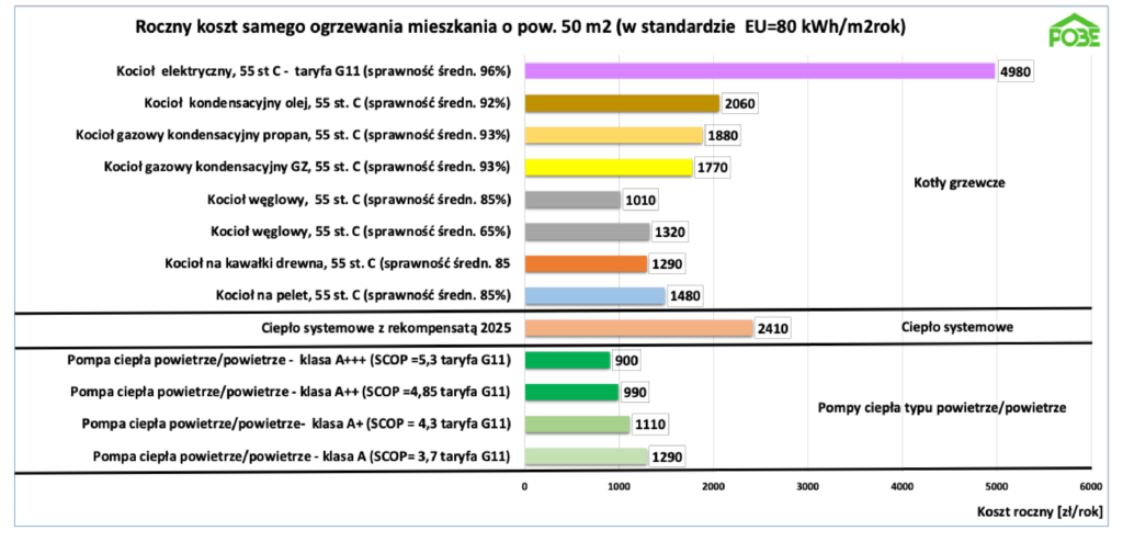 Rys. 5. Przykładowe roczne koszty ogrzewania mieszkania o powierzchni 50 m2, w budynku o standardzie EU = 80 kWh/(m2 ·rok). W zestawieniu ujęto różne typy kotłów, ciepło systemowe oraz pompy ciepła typu powietrze-powietrze w klasach energetycznych dla ogrzewania od A do A+++.