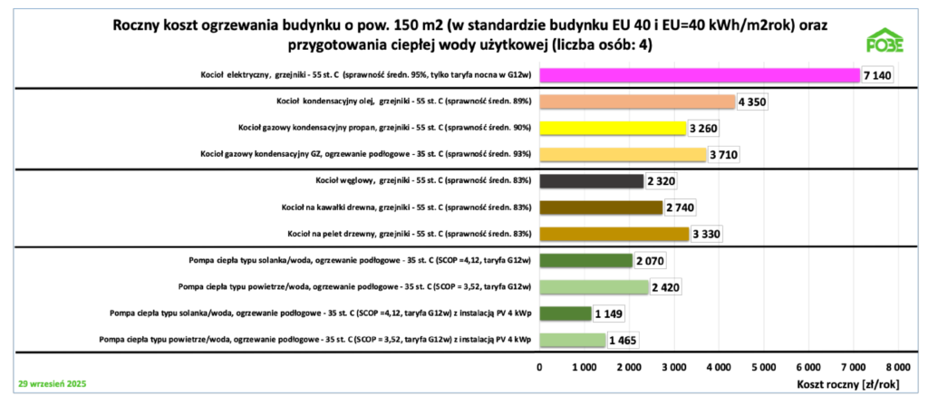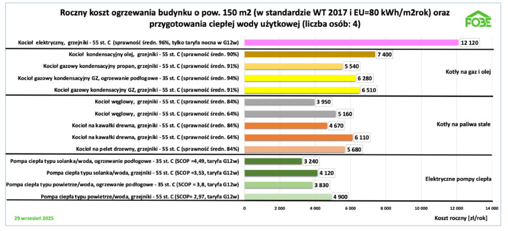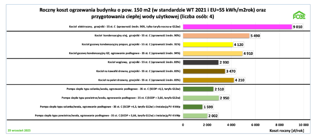 Rys. 1. Przykładowe roczne koszty ogrzewania budynku jednorodzinnego o powierzchni 150 m2, poddanego termomodernizacji do standardu WT 2017 (EU 80 kWh/(m2 ·rok)), wraz z kosztem przygotowania ciepłej wody użytkowej dla 4-osobowej rodziny. Dane uwzględniają koszty energii w III kw. 2025 r.