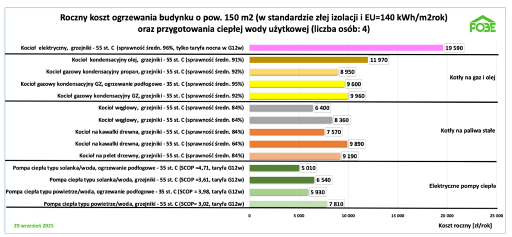 Rys. 2. Przykładowe roczne koszty ogrzewania budynku jednorodzinnego o powierzchni 150 m2 przed termomodernizacją (EU 140 kWh/(m2 · rok)), wraz z kosztem przygotowania ciepłej wody użytkowej dla 4-osobowej rodziny. Dane uwzględniają koszty energii w III kw. 2025 r.
